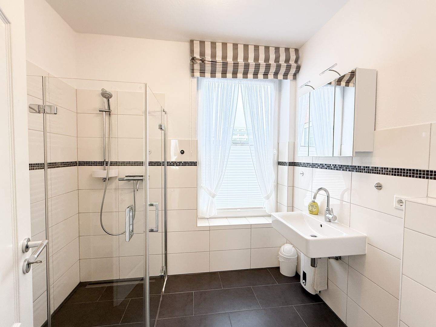 Das Badezimmer des „Kleinen Verstecks“ ist funktional und komfortabel gestaltet. Es verfügt über eine bodengleiche Dusche, Waschbecken, Haartrockner und einen Spiegel sowie über ein Fenster, das für angenehmes Tageslicht sorgt. Ein Ganzkörperspiegel steht ebenfalls zur Verfügung.