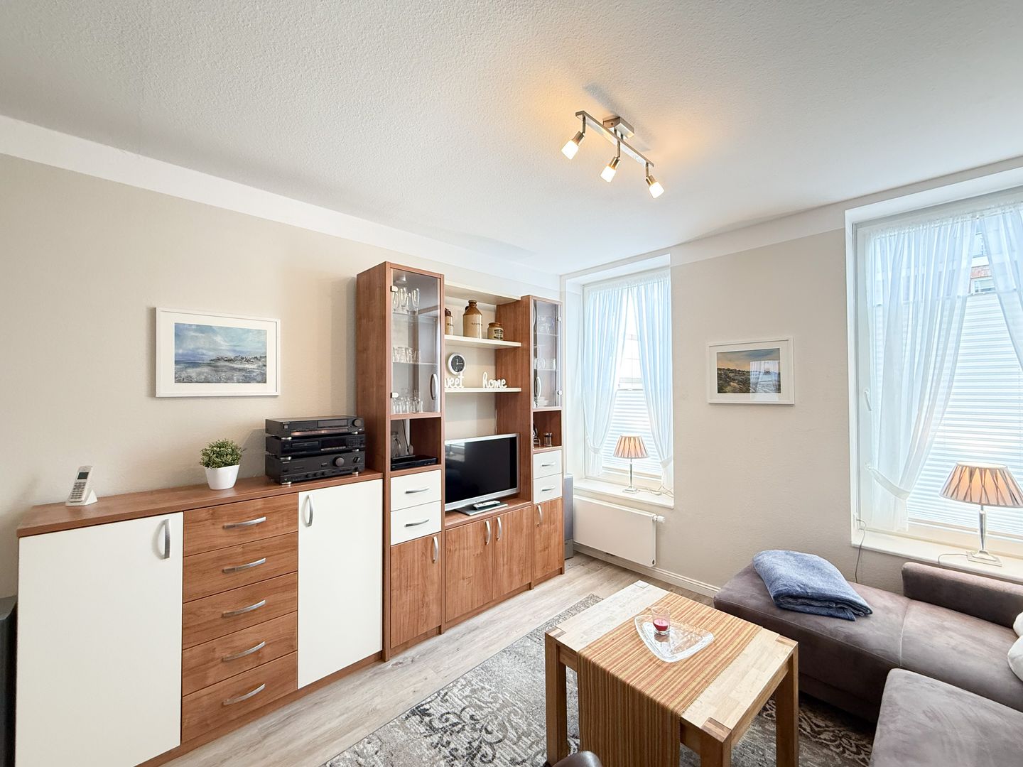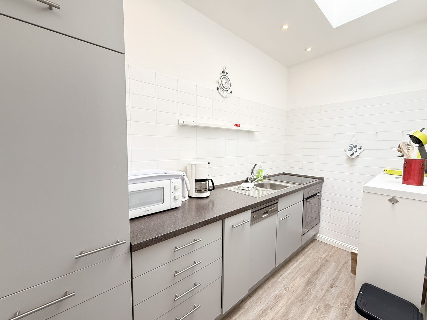 Das „Kleine Versteck“ überzeugt mit einer modernen, offen zum Wohnzimmer gestalteten Küche, die sehr gut für Selbstversorger eingerichtet ist. Sie finden eine vollständige Küchenausstattung vor, darunter Ceranherd, Backofen, Mikrowelle, Spülmaschine, Kühlschrank mit Gefrierfach, Senseo-Espressomaschine, Kaffeemaschine, Wasserkocher und Toaster. Geschirr, Besteck und sämtliche Küchenutensilien sind ebenfalls vorhanden. Für gemeinsame Mahlzeiten steht ein Esstisch bereit, das Wohnzimmer lädt mit Sofa und Sessel sowie einer HiFi-Anlage und einem Fernseher zu entspannten Stunden ein. Kostenloses WLAN und Internet ermöglichen das Arbeiten oder Kommunizieren mit Freunden und Familie.